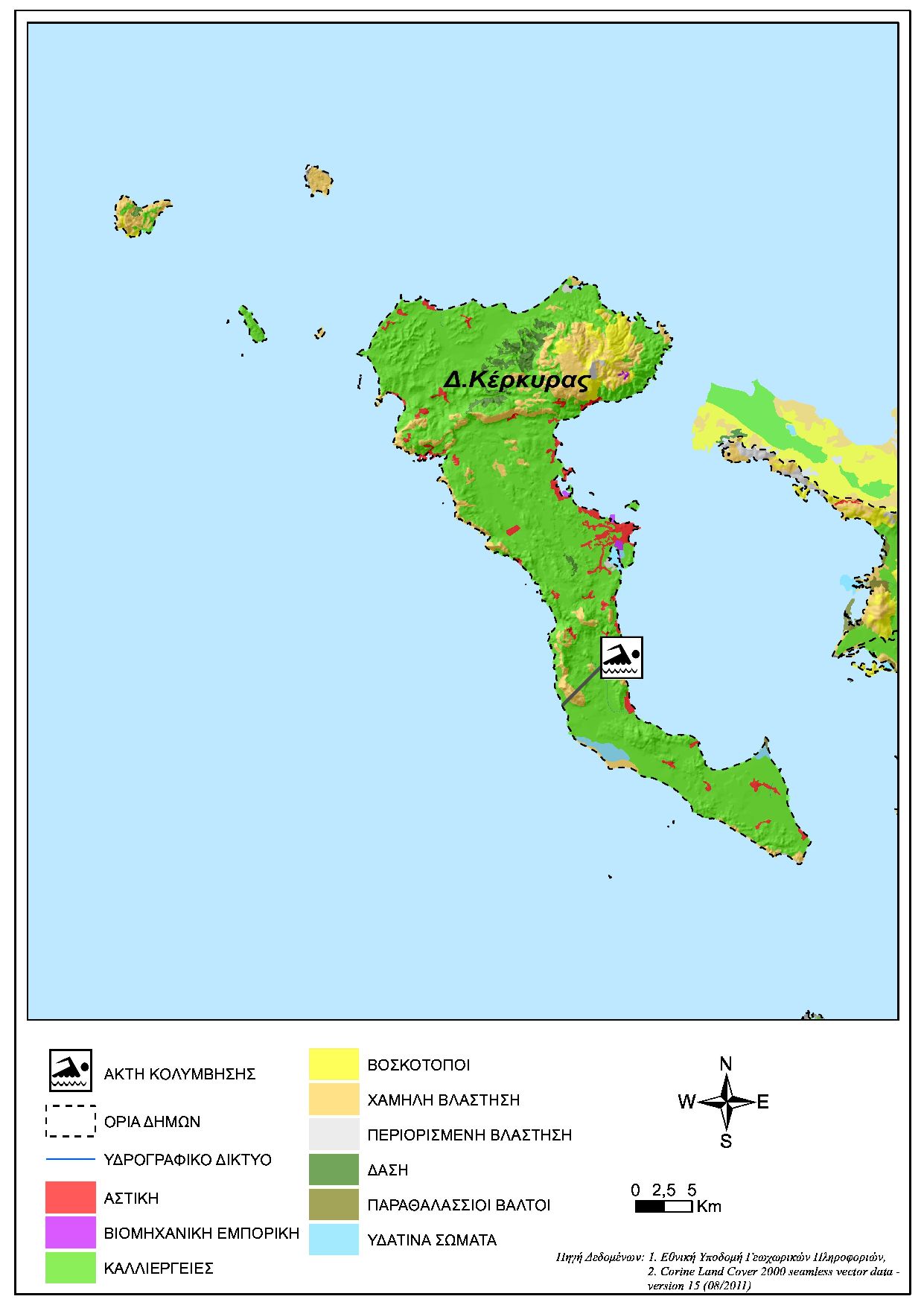 Η ακτή εντάσσεται στο Υδατικό Σύστημα Ήπειρος (EL05), στην Λεκάνη Απορροής Ποταμού Κέρκυρας - Παξών (EL0534) και στο Παράκτιο Υδατικό Σύστημα «Δυτ. και Βορ. Ακτές Κέρκυρας» (EL0534C0009N), του οποίου η οικολογική κατάσταση έχει χαρακτηριστεί ως «Καλή», με βάση τα αποτελέσματα της ταξινόμησης, που πραγματοποιήθηκε στην 1η αναθεώρηση των Σχεδίων Διαχείρισης Λεκανών Απορροής Ποταμών (ΣΔΛΑΠ) και την αντίστοιχη Στρατηγική Μελέτη Περιβαλλοντικών Επιπτώσεων (ΣΜΠΕ) (ΦΕΚ Β 4681/29.12.2017). Στο Υδατικό Σύστημα αντιστοιχεί σταθμός εποπτικής παρακολούθησης που έχει οριστεί στο πλαίσιο εφαρμογής του Άρθρου 8 της Οδηγίας 2000/60/ΕΚ. Στην περιοχή εντοπίζεται η λιμνοθάλασσα Κορισσίων που είναι αναγνωρισμένο μεταβατικό υδάτινο σώμα στο πλαίσιο της Οδηγίας 2000/60/ΕΚ. Η ευρύτερη περιοχή χαρακτηρίζεται ως περιοχή προστασίας - διατήρησης φυσικού περιβάλλοντος και είναι ενταγμένη στο δίκτυο Natura 2000 ("Λιμνοθάλασσα Κορισσίων" με κωδικό GR2230002, "Λιμνοθάλασσα Κορισσίων και Νήσος Λαγούδια" με κωδικό GR2230007).